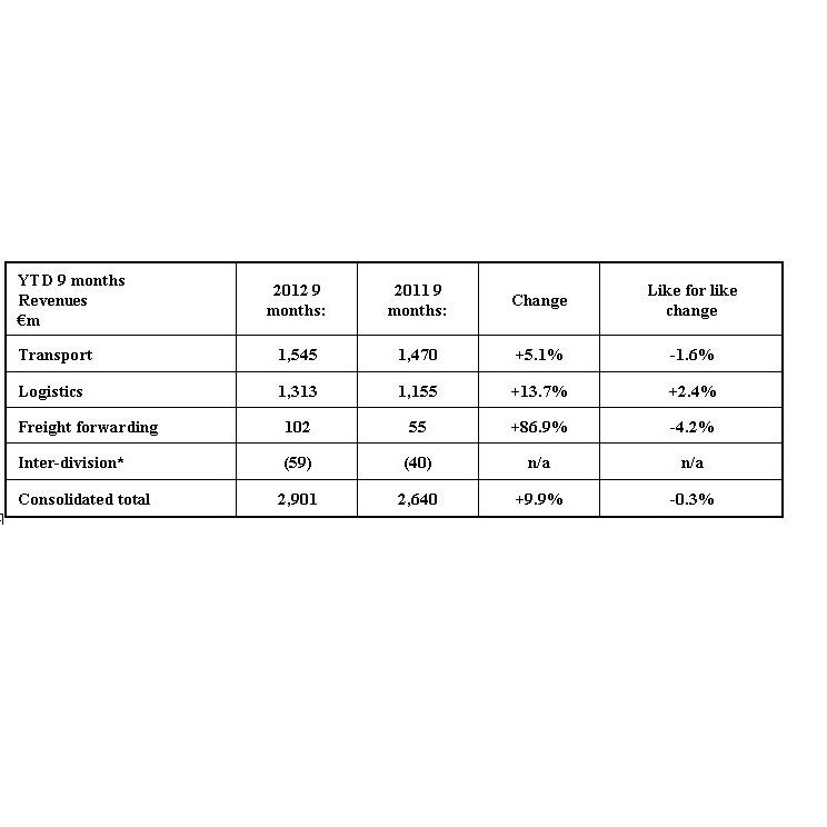 For the first nine months of 2012, Norbert Dentressangle has reported an increase of 9.9 percent in consolidated revenues, compared to the same period the previous year.Revenues came in at €2901 million, largely due to acquisitions made in 2011. Like for like revenues were stable given that the growth in the logistics business was offset by a slowdown in transport. Revenues earned outside France now account for 59 percent of the total.