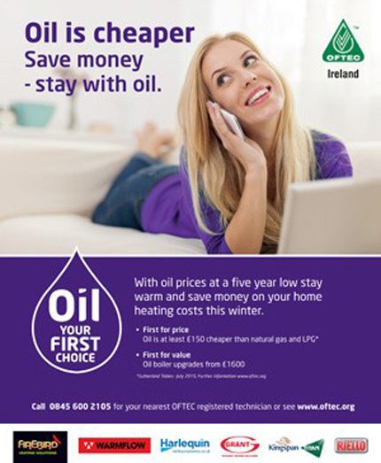 With oil prices at a five-year low, boiler manufacturers Firebird, Grant and Warmflow together with tank manufacturers Harlequin and Kingspan and burner manufacturer Riello worked together to promote a pro oil message to consumers reminding them that ‘oil is cheaper’ than all the alternatives in Northern Ireland.
